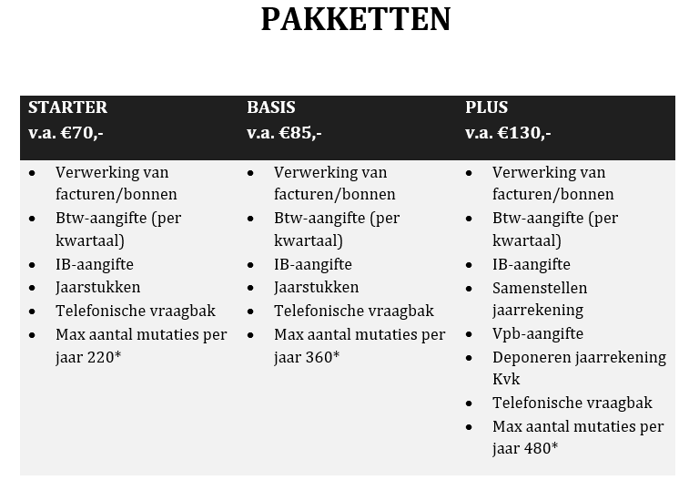 Tarieven Offerte aanvragen – Alle bedragen zijn exclusief BTW – Per extra mutatie boven het max aantal wordt €1 in rekening gebracht* Dit delen: Klik om te delen op X (Opent in een nieuw venster) X Klik om te delen op Facebook (Opent in een nieuw venster) Facebook Vind-ik-leuk Aan het laden...
